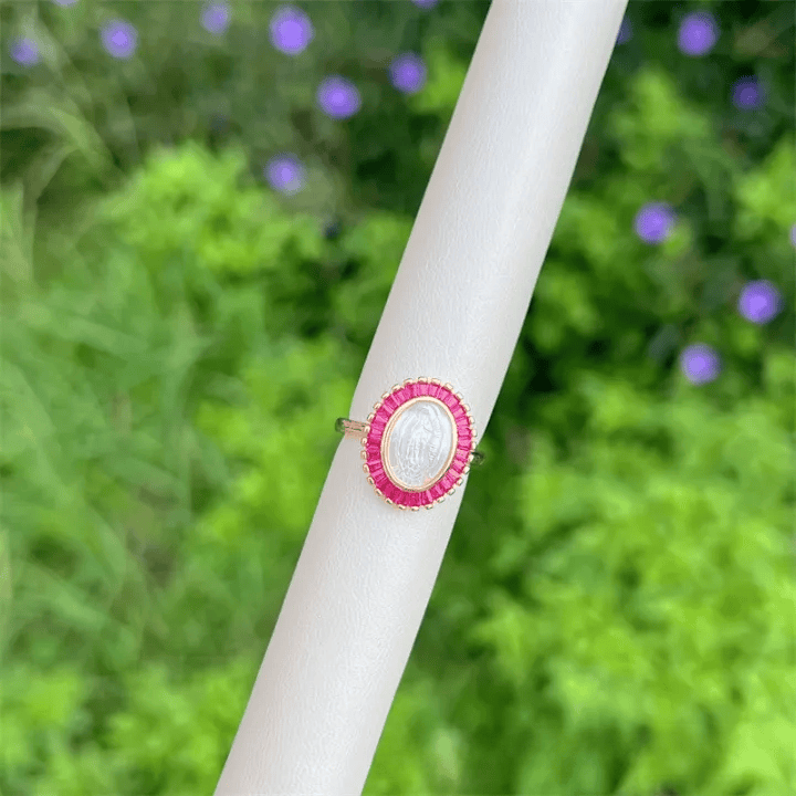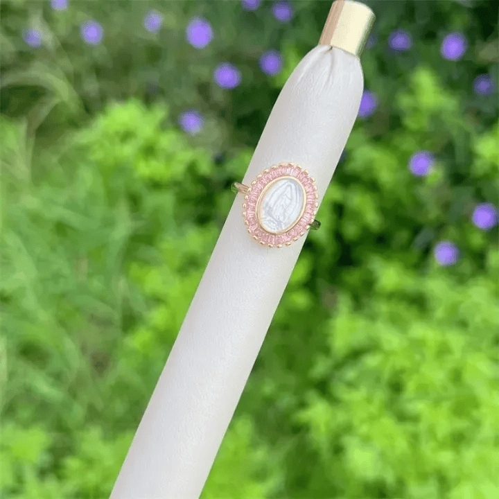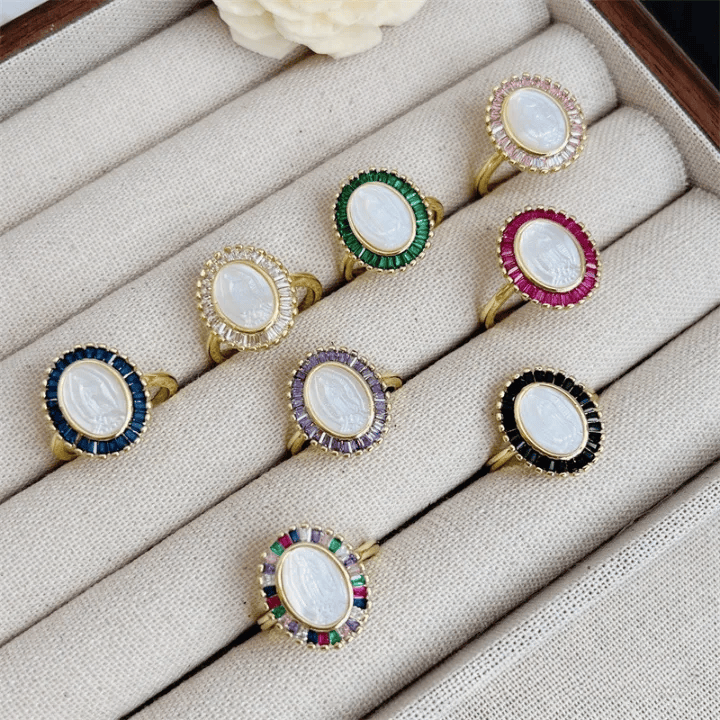 A Tender Tribute to Her Care This ring (offered in multi-tone styles) merges a white Our Lady cameo with colorful zircon accents (set in 18K gold-plated copper) — pairing radiant design with the quiet comfort of her intercession to craft a wearable reminder of grace.