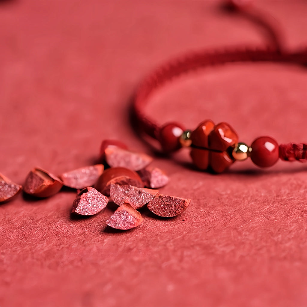 The vibrant red string, traditionally believed to ward off negativity and attract protection, anchors a polished cinnabar four-leaf clover—a fusion of two powerful symbols. In Eastern traditions, cinnabar is revered for its protective energy, while the four-leaf clover universally represents serendipity and luck. Two lustrous red beads and gold-toned accents add balance, symbolizing harmony between earthly energy and celestial guidance.