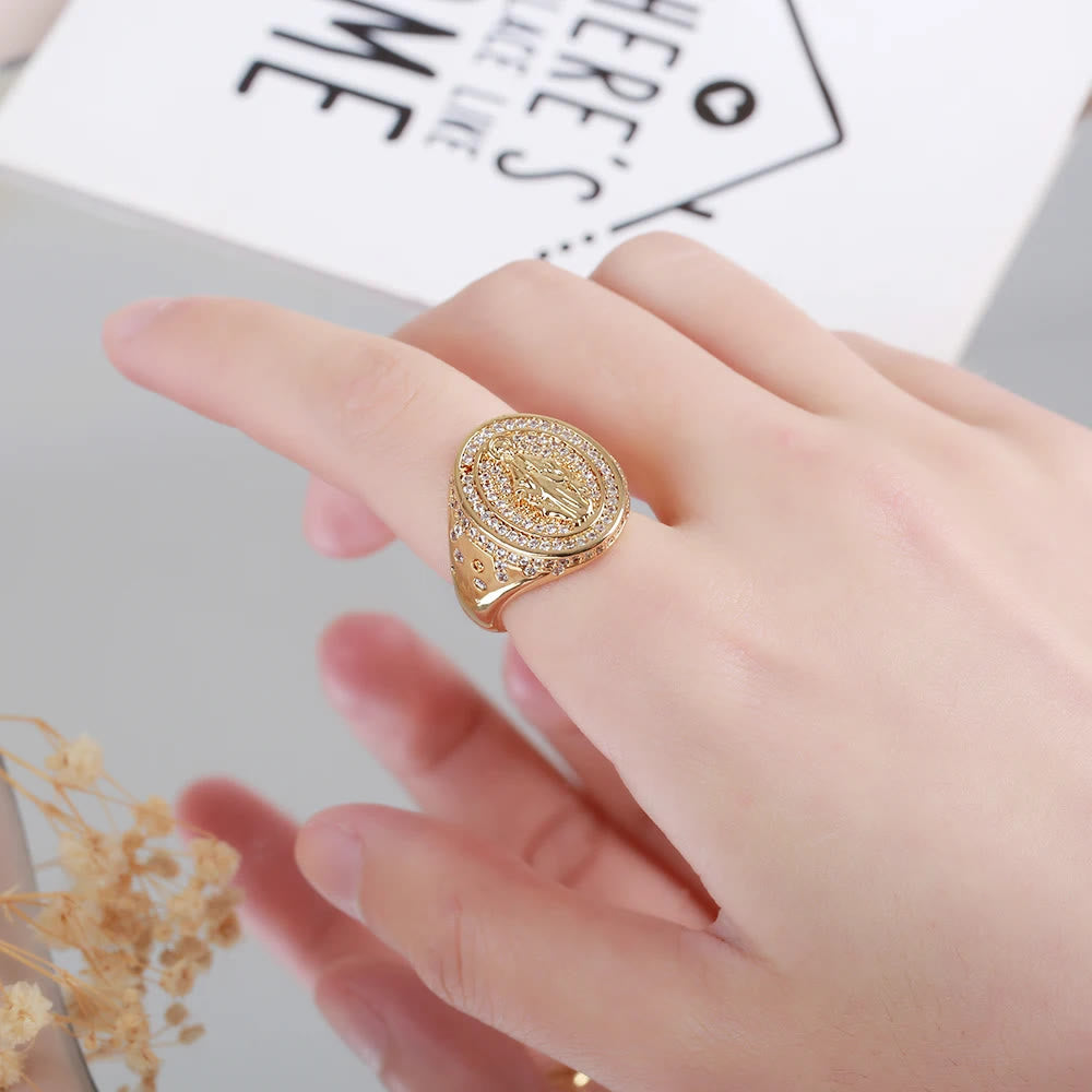 Our Lady of Guadalupe Oval Sparkle Signet Ring, Radiant Devotion A bold, signet-style ring features an oval relief of Our Lady of Guadalupe, surrounded by two tiers of sparkling clear stones. Available in polished silver and gold finishes, this striking ring anchors faith in a visible declaration of her maternal grace and intercession.