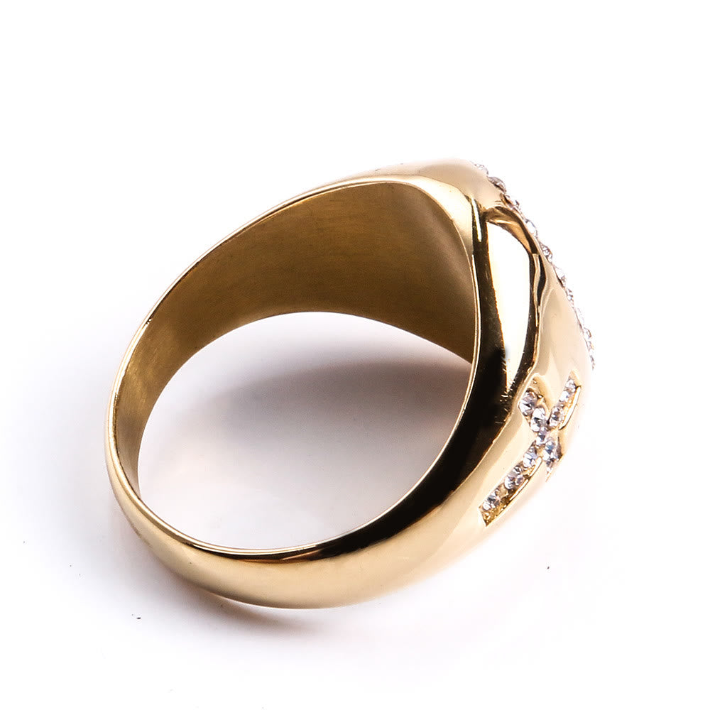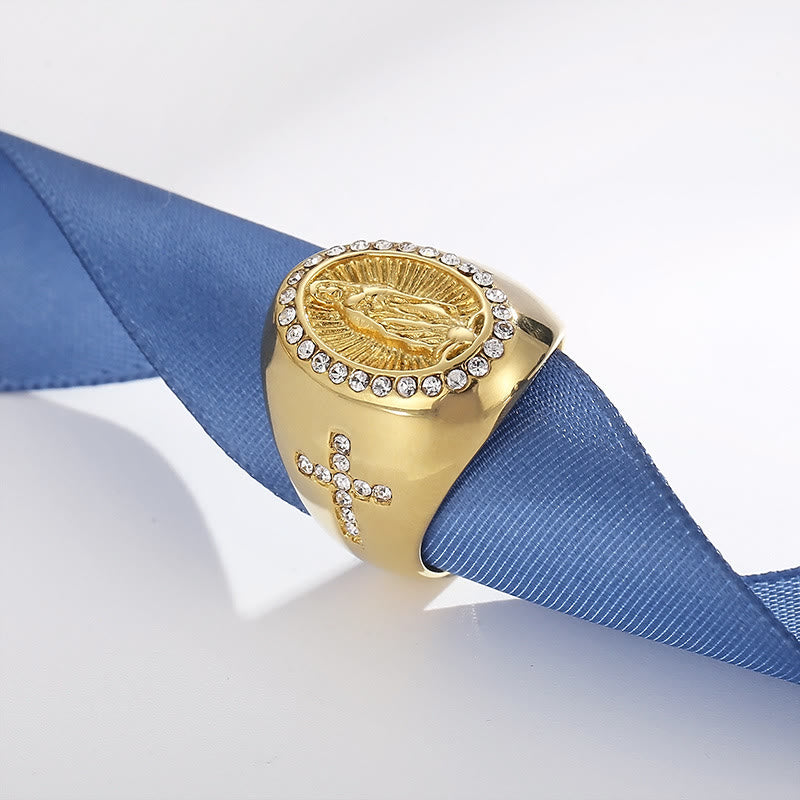 Our Lady of Guadalupe & Cross Statement Ring, Radiant Devotion A substantial signet-style ring features a detailed relief of Our Lady of Guadalupe, framed by sparkling clear stones, with an ornate cross accent on the band. Available in polished silver and gold finishes, this striking ring anchors faith in a visible declaration of her maternal grace and intercession.